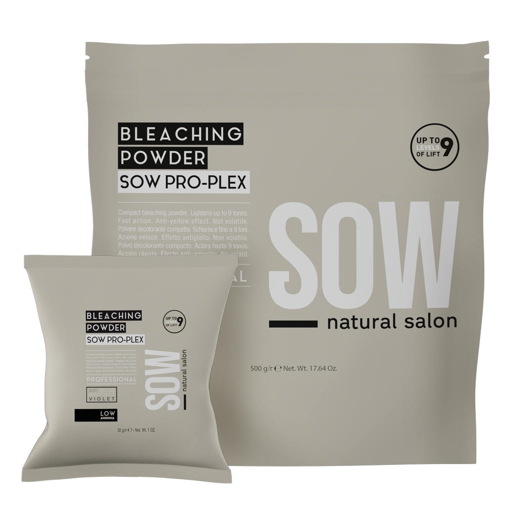 SOW COLOR SO REAL SOW COLOR BLEACHING POWDER BLEACHING POWDER SOW PRO-PLEX 30 gr / 500 gr + PERFORMANCE - IMPACTO POLVO DECOLORANTE COMPACTO Aclara hasta 9 tonos. Acción rápida. Efecto anti-amarillo. No volátil. ALTA ELEVACIÓN: 9 NIVELES Alcanza hasta 9 niveles de aclaración. ACLARACIÓN RÁPIDA Tiempo de procesamiento 20% más rápido GRAN CONSISTENCIA Alta adherencia, mejor textura, adecuada para toda técnica. EFECTO ANTI-AMARILLO Resultados rubios perfectos
